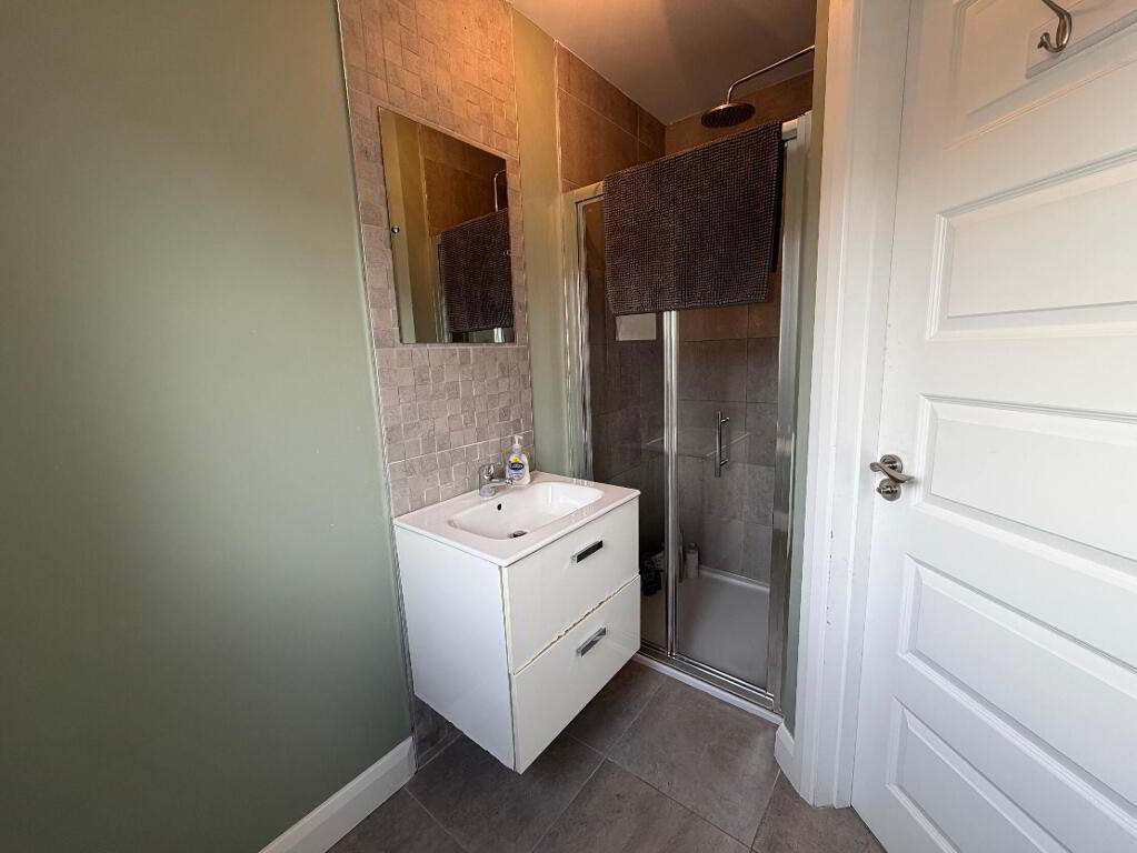 ENSUITE SHOWER ROOM Glazed shower cubicle with controlled rainfall shower and separate handheld shower, low flush W/C, vanity unit sink, wall tiling, ceramic tiled flooring, extractor fan