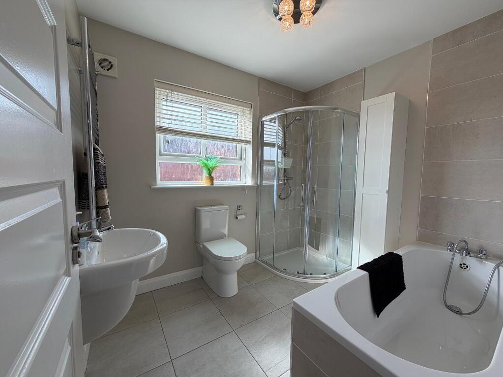 BATHROOM Modern white suite comprising panelled bath, glazed shower cubicle with thermostatic controlled shower, low flush W/C, half pedestal wash hand basin, wall tiling, ceramic tiled flooring, chrome heated towel rail, extractor fan