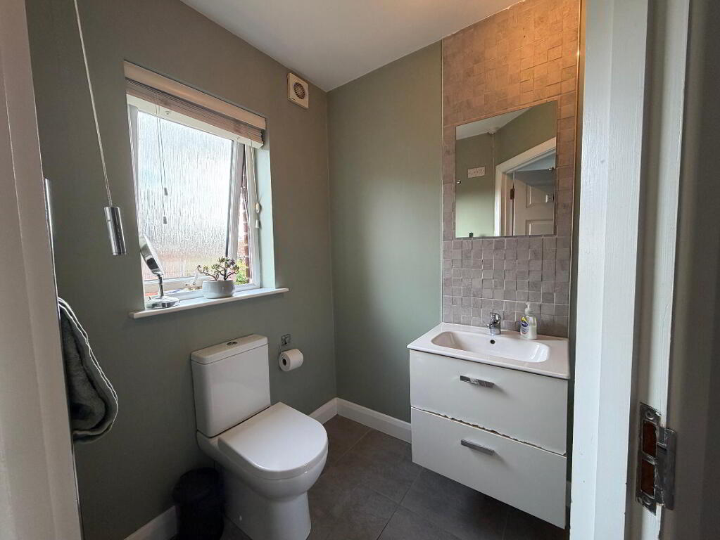 GROUND FLOOR W/C Low flush W/C, half pedestal wash hand basin, tiled splash back, ceramic tiled flooring