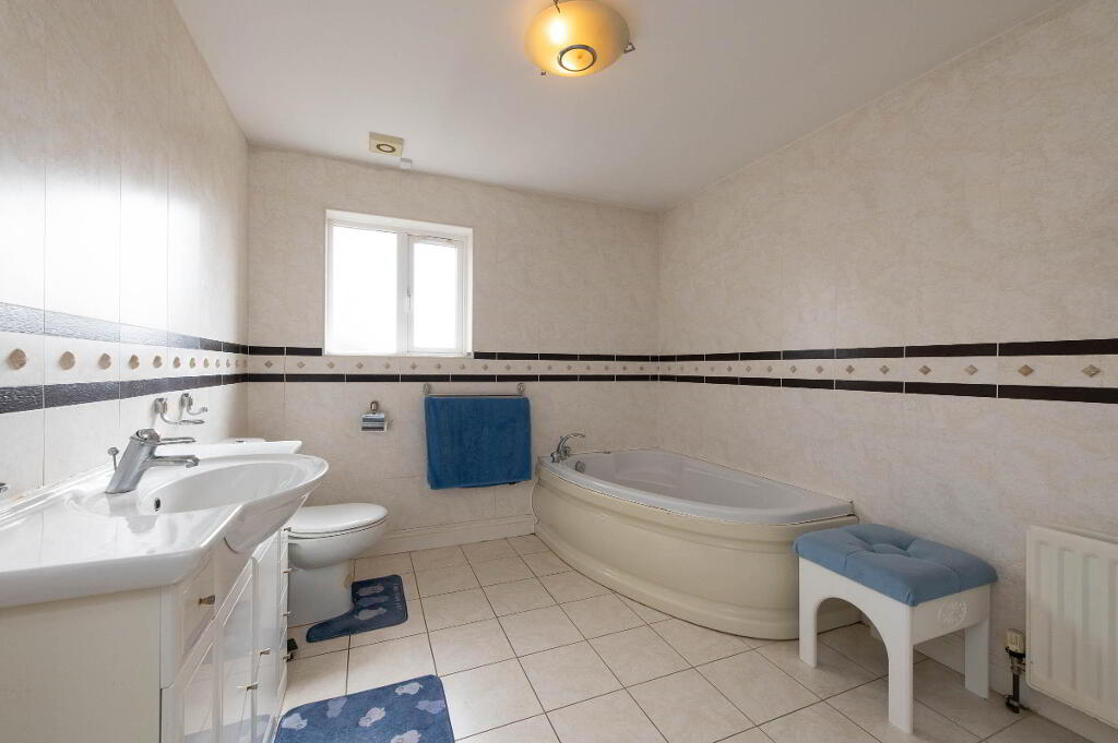 BATHROOM Bathroom with white suite. Corner bath with mixer tap. Low flush WC. Pedestal wash hand basin. Tiling. Ceramic tiled floor. Extractor fan.