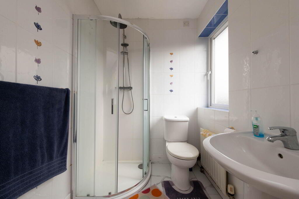 ENSUITESHOWERROOM Shower unit with overhead rain shower and separate attachment. Low flush WC. Pedestal wash hand basin. Extractor fan. Tiling. Ceramic tiled floor.