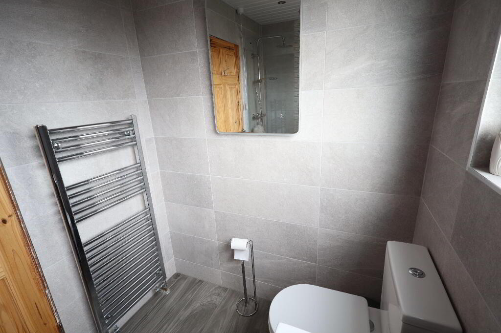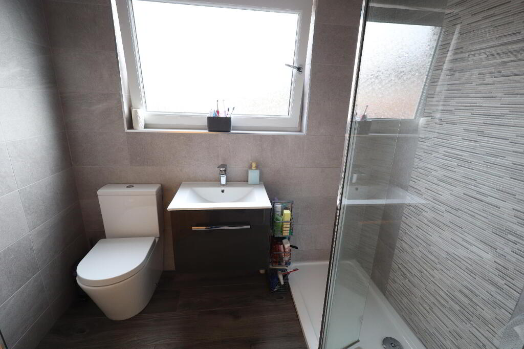 MODERN SHOWER ROOM Shower unit with controlled shower and rainwater effect shower head, glazed shower screen, floating vanity sink unit with mixer taps, low flush W/C, chrome heated towel rail