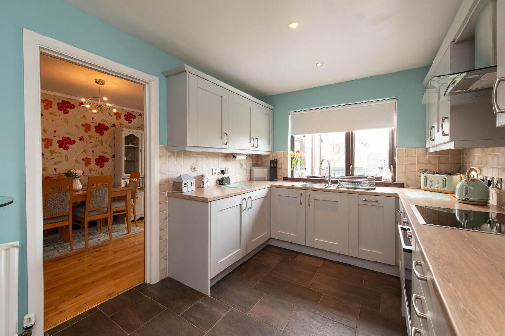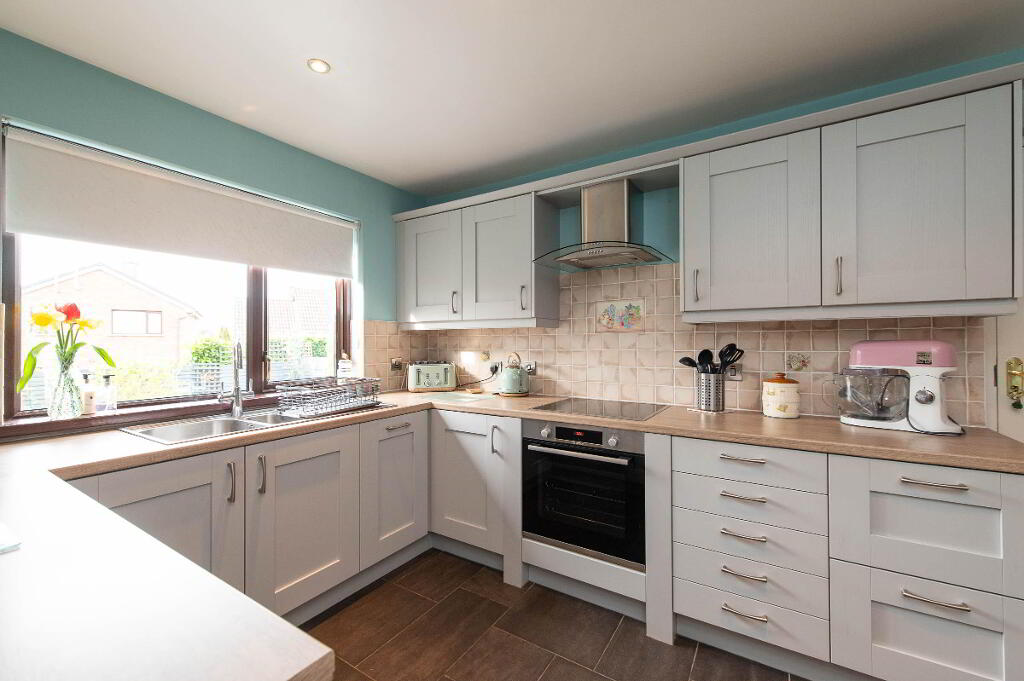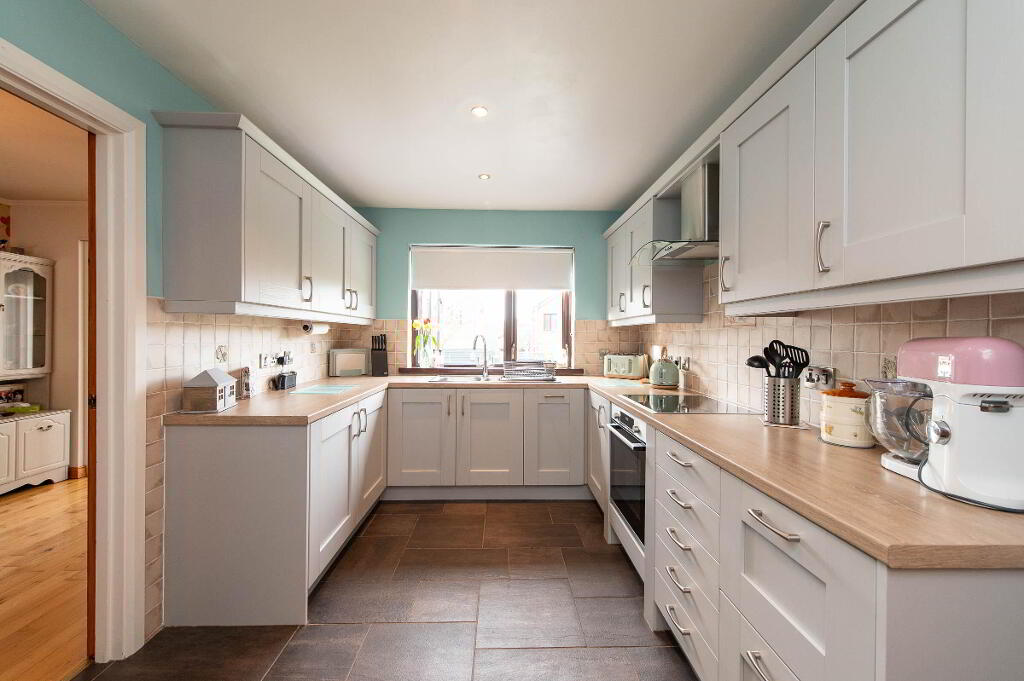 KITCHEN12' 9" x 9' 2" (3.89m x 2.79m) Built in units. Round edge work surfaces. Single drainer stainless steel sink unit with mixer tap and vegetable basin. Inlaid hob unit and under oven. Stainless steel extractor fan. Integrated fridge. Integrated dishwasher. Downlighters. Under stair storage. Ceramic tiled floor.