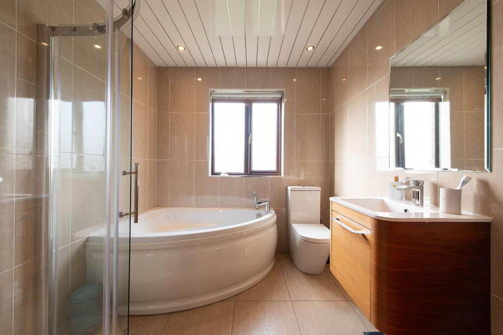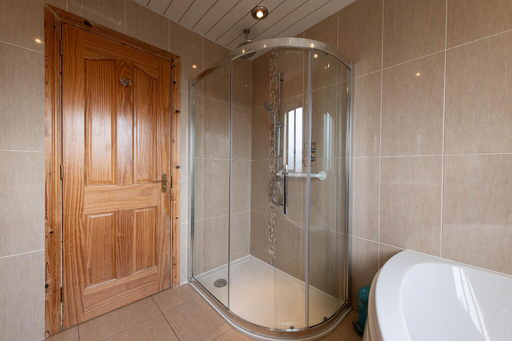 BATHROOM White suite. Panelled bath with mixer tap and telephone hand shower. Thermostatic controlled shower. Vanity unit. Low flush WC. Fully tiled walls. uPVC ceiling. Extractor fan. Downlighters.