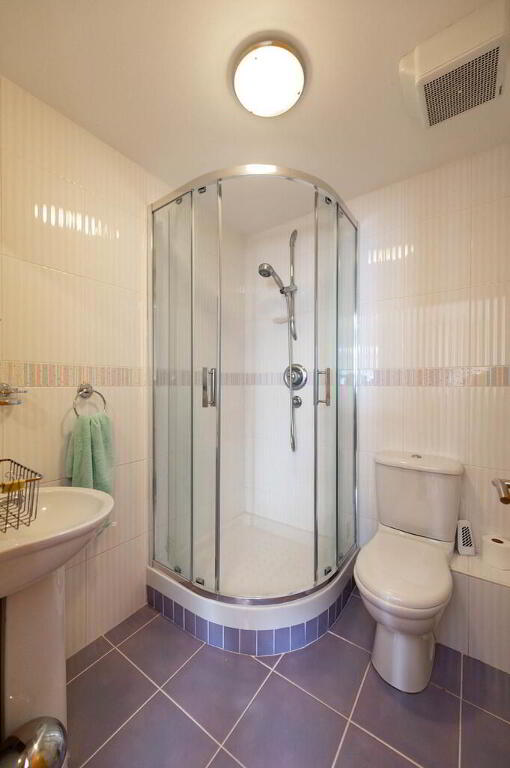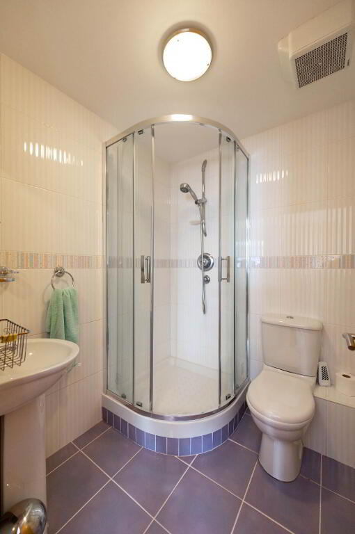 ENSUITE SHOWER ROOM Low flush WC, pedestal wash hand basin, shower unit with controlled shower, fully tiled walls, extractor fan, tiled floor