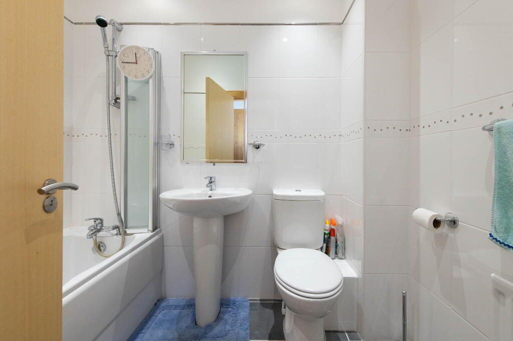 BATHROOM Modern white suite, panelled bath with mixer taps, telephone hand shower, folding door, ceramic tiled flooring, fully tiled walls, downlighters, low flush WC, extractor fan