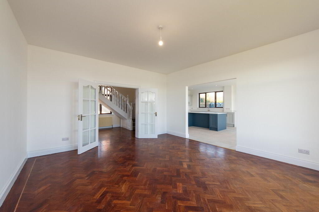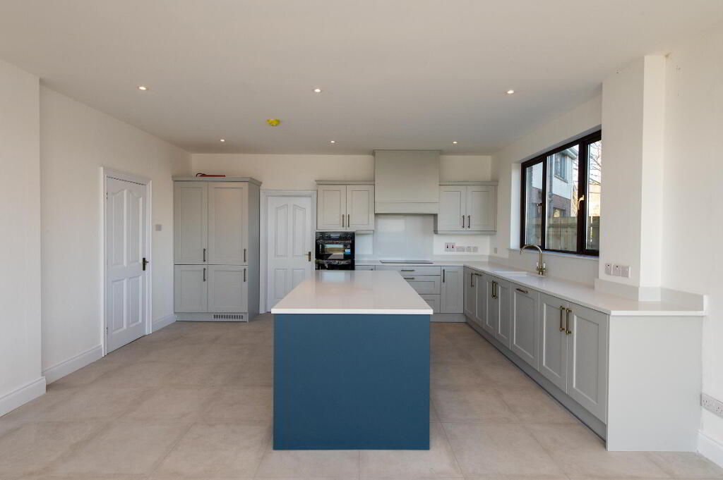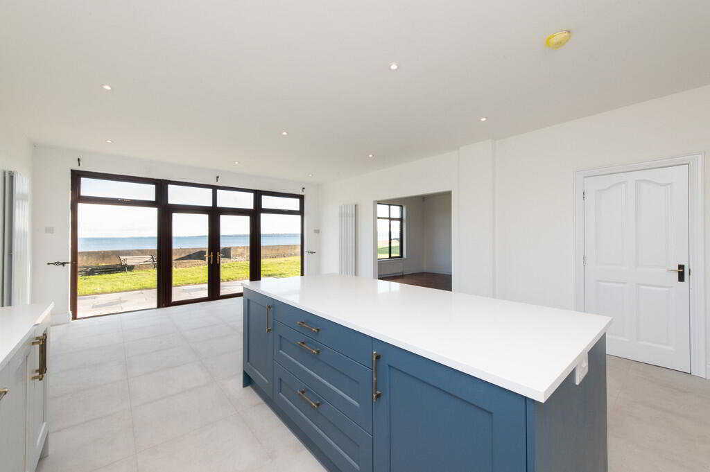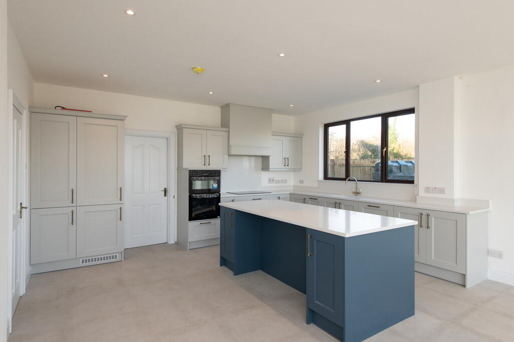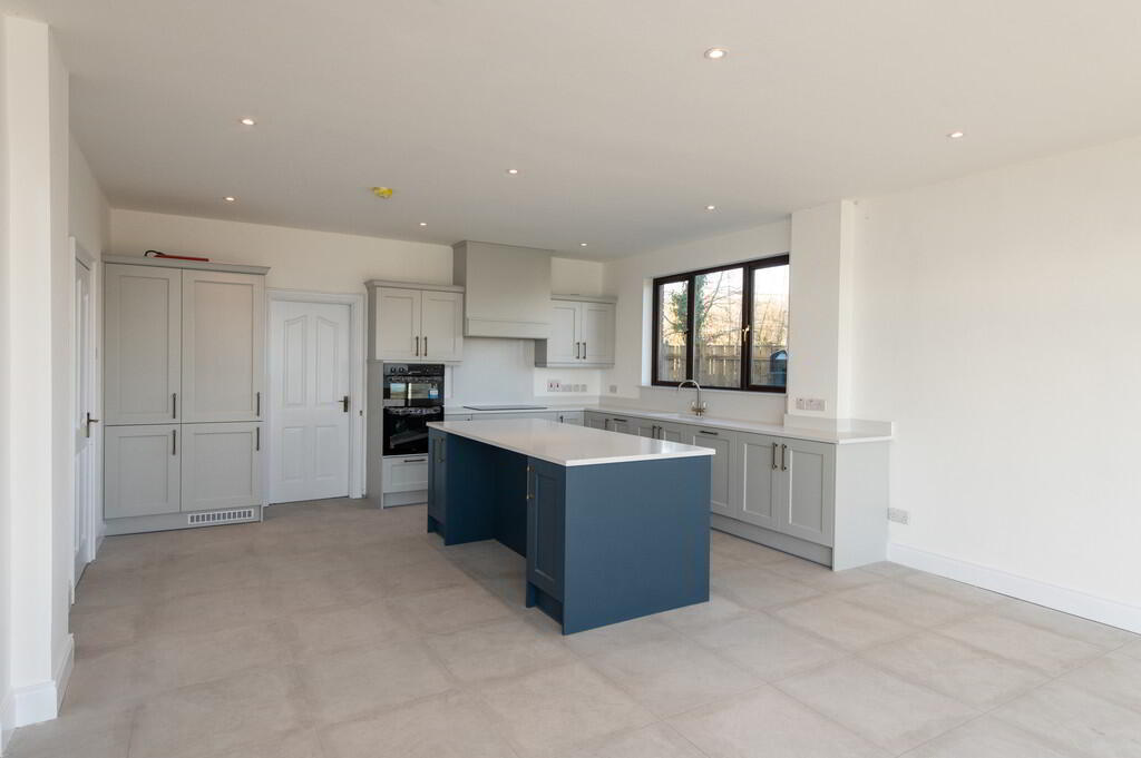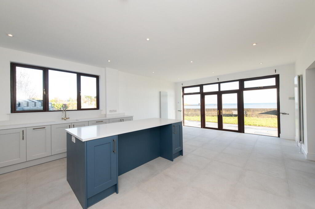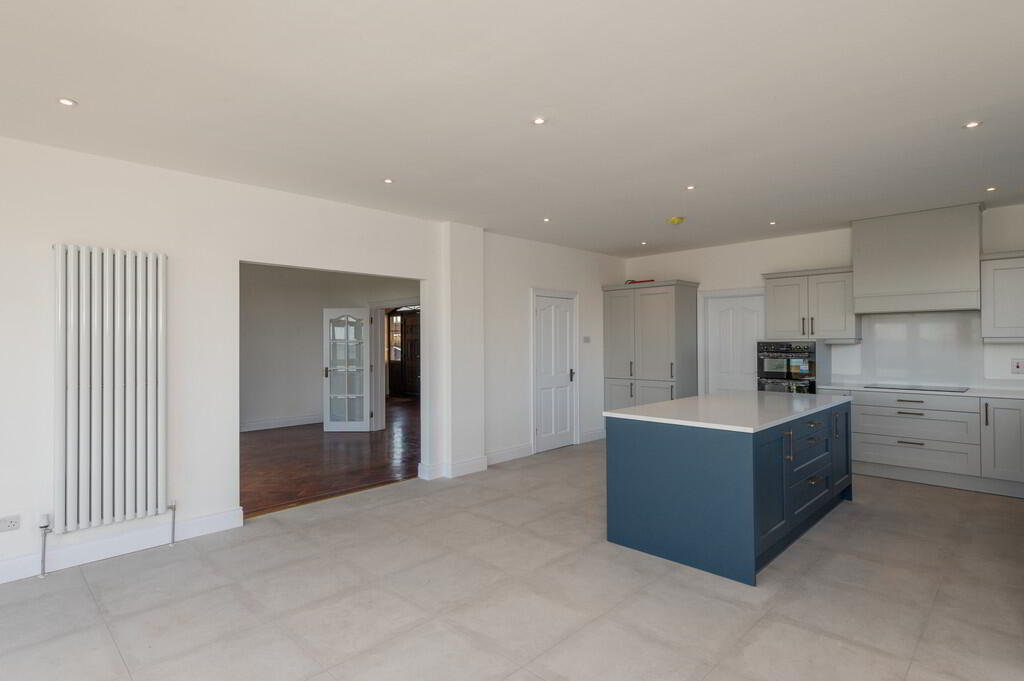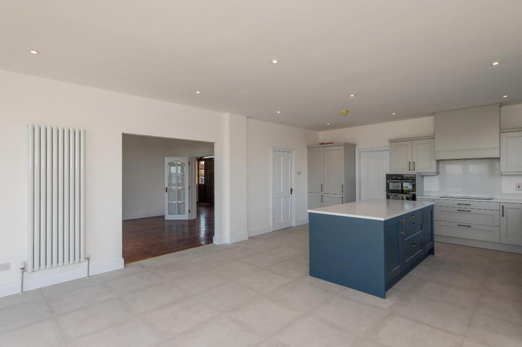 KITCHEN 25' 3" x 16' 3" (7.7m x 4.95m) Recently fitted luxurious kitchen with range of high and low level soft close units, Quartz worksurfaces, built in induction hob, built in double oven, canopy, extractor fan, built in Bosch dishwasher, built in Beko fridge and freezer, Caple sink unit with mixer tap and Quartz drainer, island unit with seating area, ceramic tiled flooring, downlighters, doors to garden, open plan to: