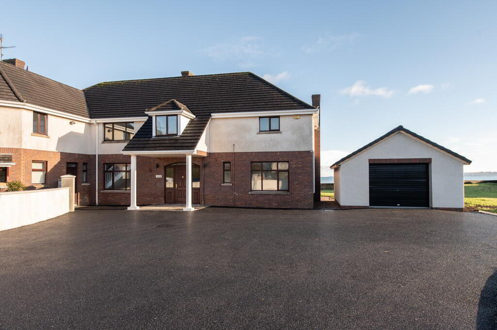 Rear in generous lawn and patio area with outstanding views of Belfast Lough and County Down Coastline