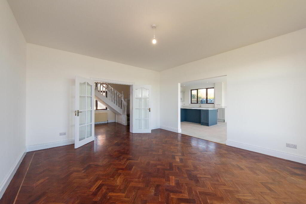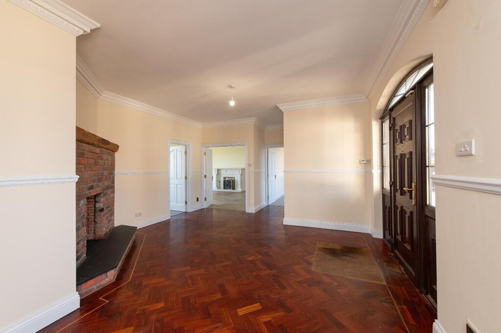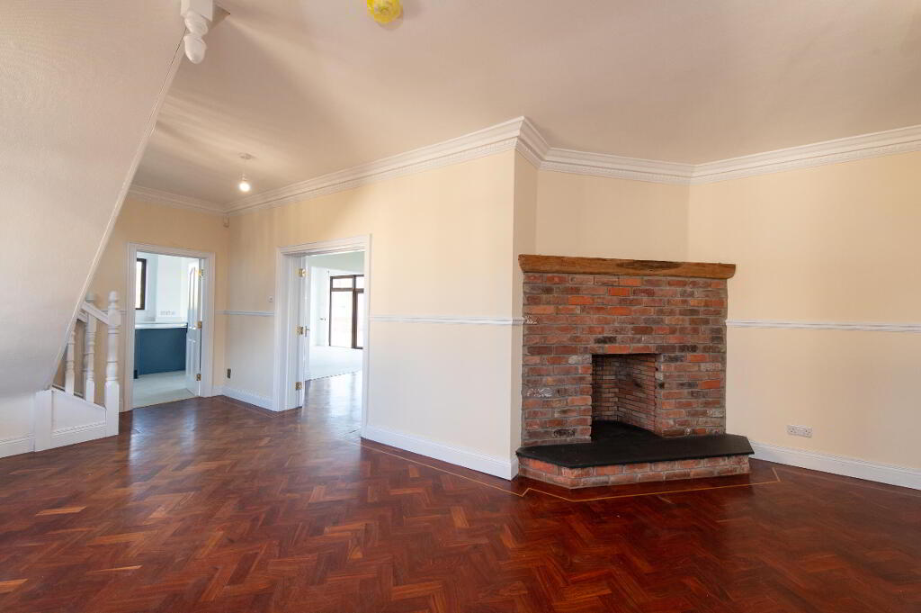 RECEPTION HALL Mahogany parquet solid wood flooring, feature red brick fireplace with open fire