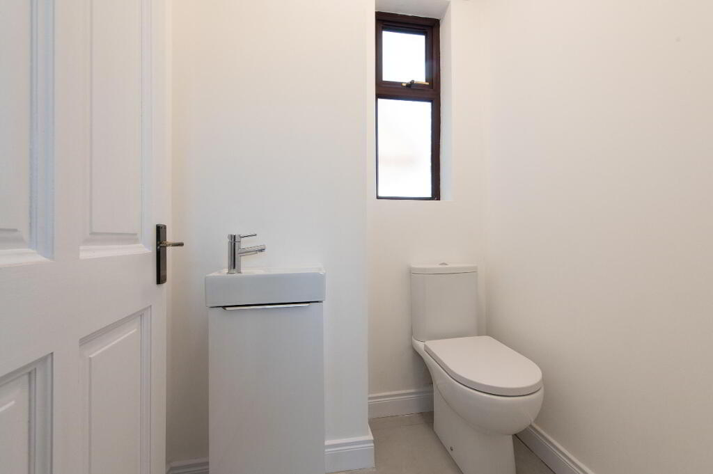 CLOAKS Low flush WC, pedestal wash hand basin, extractor fan, tiled flooring