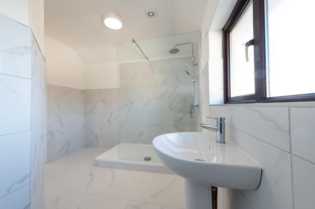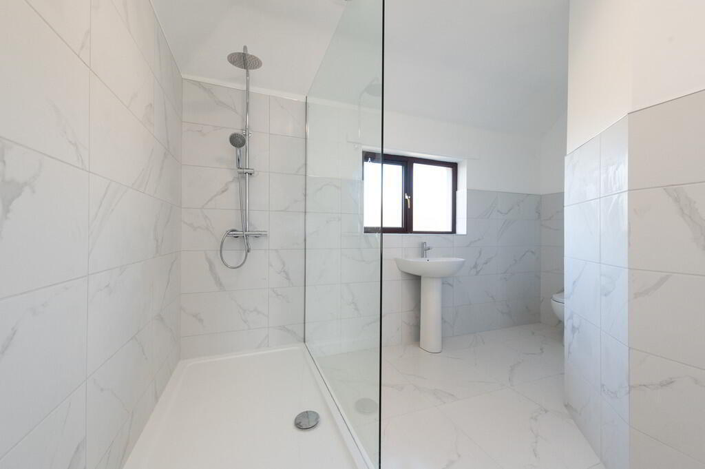 ENSUITE Low flush WC, pedestal wash hand basin, walk in shower unit with controlled rain shower, luxury ceramic tiled flooring, heated towel rail, extractor fan