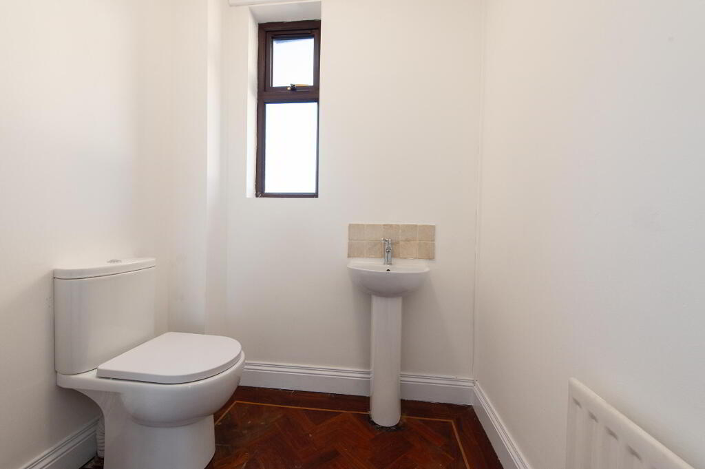 CLOAKS Low flush WC, pedestal wash hand basin, mahogany parquet solid wood floor