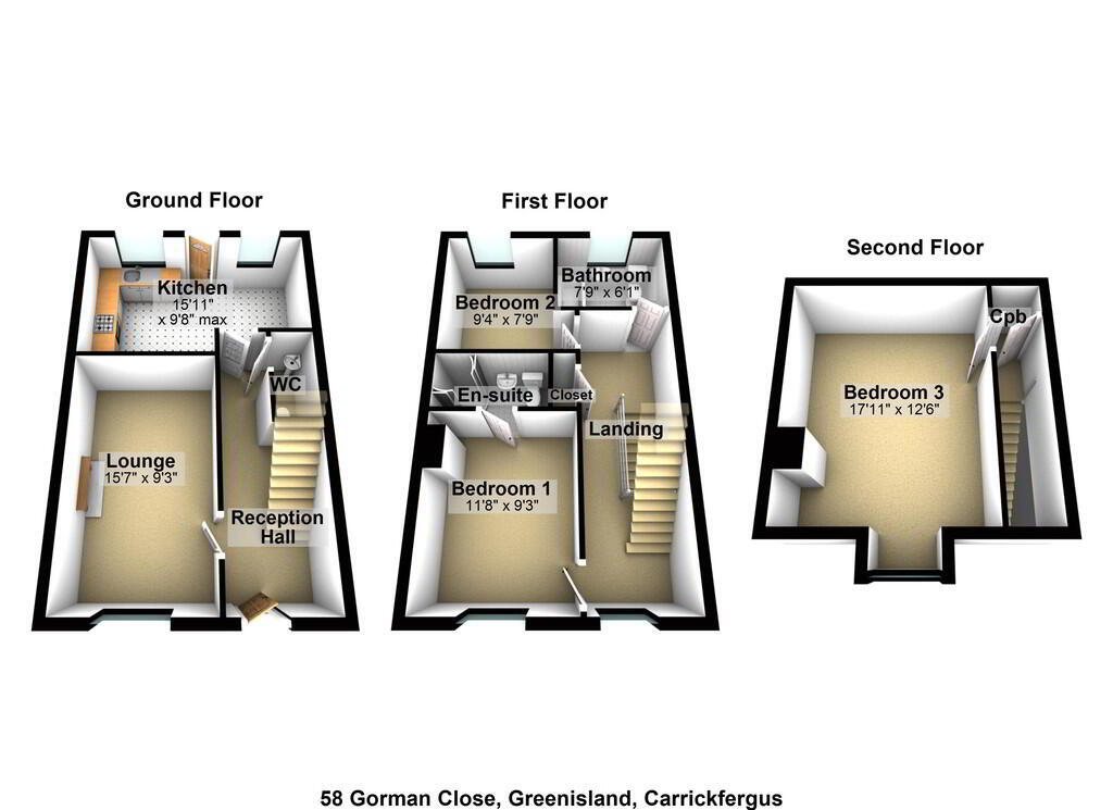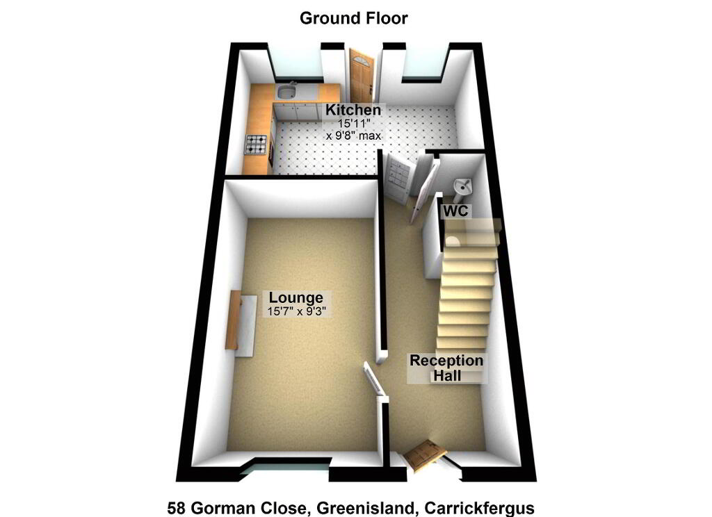 This is a modern townhouse situated in a popular area of Greenisland. The property is well presented throughout offering generous accommodation over three levels. The property enjoys views of Knockagh and Belfast Lough and close to many amenities including Greenisland train station, schools and Greenisland golf club. Early views is advised.