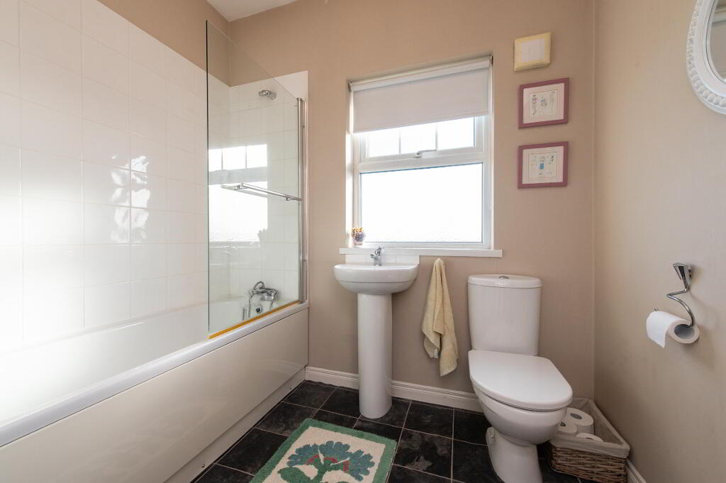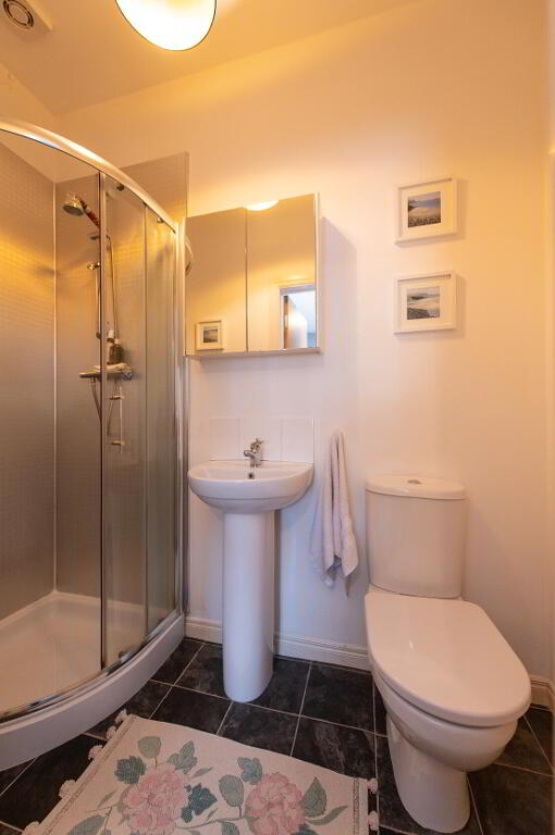 ENSUITE Low flush W/C, pedestal wash hand basin, corner glazed shower unit with controlled shower, views of Knockagh